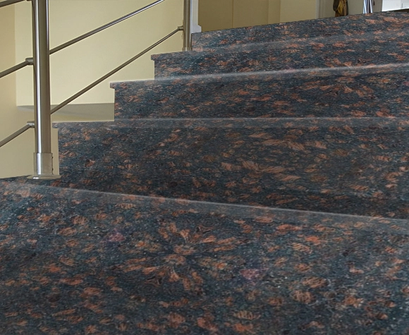 Tan Brown Deccan Granite Staircases bring a bold and sophisticated touch with their deep brown and black tones, enhanced by fine, natural textures. Built for durability, this granite stands up to heavy foot traffic, making it perfect for both residential and commercial stairways. The polished finish adds a smooth, luxurious look while highlighting the stone’s earthy patterns. Its timeless beauty pairs well with a variety of design styles, from modern to traditional. Step into elegance with the lasting charm of Tan Brown Deccan Granite Staircases.